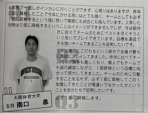やっとリーグ戦のパンフレットを入手した。その中にある主将の意気込み記事。 4戦終わって得点ランキング4位に入るも実力差がありすぎてプレータイムが短い。ベンチメンバーの経験の場になっているも仕方がない。このリーグでは優勝のかかる最終戦だけだ。その後の入替戦に期待。