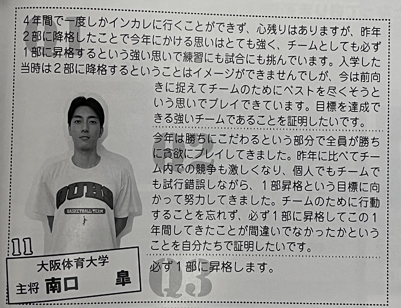 ↓クリックで動画再生 2部降格'の悔しさを胸に。7勝0敗。大阪体育大学に「負け」の二文字はない。ラストイヤーの南口皐、山田大智ら4年生が大阪体育大学を支える。No.11 南口皐 (大阪体育大学-4回生-185cm